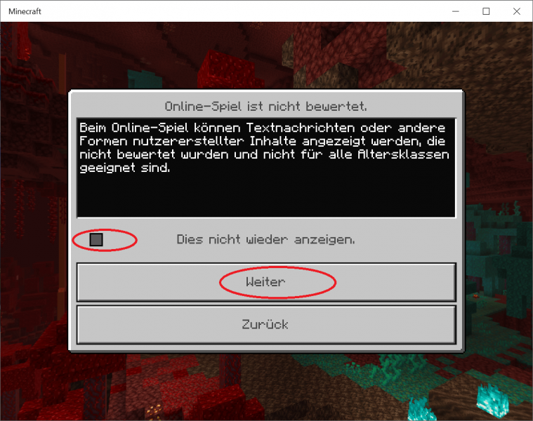 Möglicherweise bekommt ihr folgende Meldung. Diese könnt ihr mit einem Klick auf Weiter überspringen. Um sie nicht wieder angezeigt zu bekommen, könnt ihr vorher einen Haken in das Feld setzen.