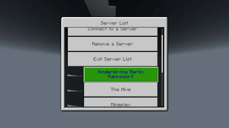 Dann sollte nach kurzer Zeit folgendes Fenster erscheinen. Solltest du dich dagegen direkt mit dem Server verbinden, guck, ob du deinen DNS Server angepasst hast (siehe oben). Hier wählst du den Kinderkirchen-Server aus. Willst du auf einem der anderen Server spielen, sind die hier weiterhin verfügbar.